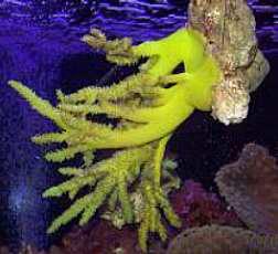 Dying, bleaching or painting not only lessens the lifespan of the coral but also make it stressed and a source of disease for the environment it will be added in. Stressed corals and anemones will come out to have a thin or watery countenance as with yellow or lime colors in naturally green specimens and tan or crème colors in once brown pigmented ones. The most rigorously stressed anemones will appear to be white colored. Bright colored tips will remain if they were natural in the beginning, as they commonly are not a zooxanthellate tincture or willingly aborted under duress. With no zooxanthellae to provide food through photosynthesis with adequate light, a bleached coral is reconciled to starve to death in weeks or months without unusual attentiveness from an aquarist with compensatory feeding of particulate or dissolved foods to the dyed victim.